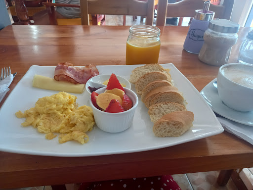 Ordered Desayuno criollo which is green plantation or yucca stuffed with cheese, eggs, juice and coffee. Price was great, $5.50. I also had a chocolate truffle with another cup of coffee. The truffle was perfect not too sweet, just enough to go with the coffee. Although I may have overdone it with the caffeine intake, I'll survive. The service was good, drinks served right away but I did have to get the menu myself. It is hanging on the pillar in the middle of the cafe, I may not have ordered the food had I not seen another table getting a sandwich. It is a relaxing environment, no one bothering you, not very crowded, smells good, tables are spaced out. There's no a/c but there's an oscillating fan to keep the place kool. I would come back for another visit...