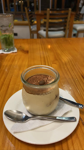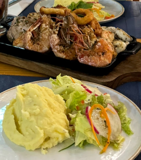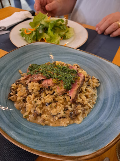 4.5 starts here. Two-level, open-air dining spot that was an excellent dining experience. Modern, stylish dark wood and black metal décor is very inviting. Open kitchen for viewing the hard-working staff. The design allows for a cooling breeze from the bay to flow thru most of the seating. Very nice. Staff was convivial and mostly easy to converse with using our rudimentary Spanish. Three meals a day available here-they open at 8 am. Full bar allows for lots of options. We enjoyed dinner on our visit. The menu has many choices-seafood, poultry, beef, pastas, etc. After perusing the menu decisions were made-a grilled chicken Caesar salad for my beloved and the Pahoehoe Risotto for myself-risotto with wild and portobello mushrooms topped with grilled tenderloin steak and pesto “tears” as the menu described. After ordering we were presented with a small basket of warm, fluffy rolls with a serving of a mild, tangy, melted cheese set in a Chinese soup spoon. Both delicious. The salad had the ubiquitous fresh greens-not just romaine-plus a nicely grilled piece of chicken breast. Topped with shaved parm and an interesting relish-origin unknown. Pronounced as “really good”. My risotto was outstanding-one of the best dishes I enjoyed in the islands. Perfectly cooked rice, deep mushroom flavor with large pieces of portobello’s, and just past rare grilled beef. The pesto tears turned out to be more like a significant spread of pesto/chimichurri. Didn’t add much but took nothing away from it. All the flavors melded together into a fantastic profile. Every bit was enjoyed. Clean plate club. As you enter the restaurant you see a refrigerated dessert case displaying many luscious looking choices. We decided to give in and try some. A chocolate mousse dish with Oreos and Bailey’s and a cake-Selva Negra. Chocolate cake layered with Amaretto mousse and cherries. Similar to a black forest cake. Not earth shattering but very tasty. This meal was one of-if not the-best we enjoyed across the three islands we visited. Highly...