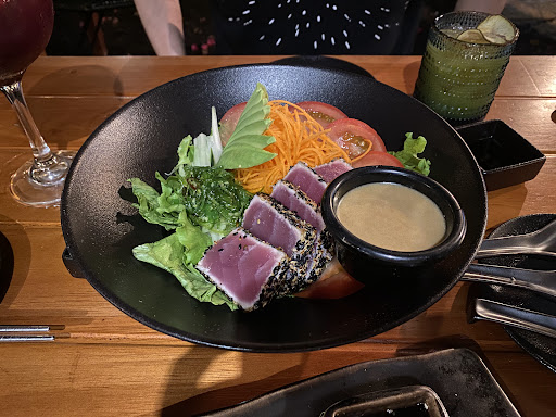 Read moreThis is a great place to enjoy an afternoon beverage. The cocktails here are excellent and is especially hard to find a good cocktail in South America, many are overly sweet. The Maracuya Mojito was amazing! The food here is also quality and the portions are large. The food is a little pricer, but this is one of the nicer restaurants on the island. The shimp salad is a good option for $8 and with lettuce, carrot, beetroot and avocado is relatively healthy, other than the fried prawns and wonton, which were very tasty and added another level of texture. The sesame coated tuna for $14 consisted of two very large portions of tuna served with rice and salad. The fire roll for $14.50 is a cool dish with some flaming theatrics. The dish is doused with a flaming shot of sake at the table, very cool or should we say hot. It is a tasty sushi roll with an interesting texture from being fried, the sake flavour is quite strong, but this can be negated with some of the passionfruit or teriyaki dipping sauce provided. Frank, the young bartender/waiter is a cool guy and his English is excellent, good for a conversation and tips on what to do...