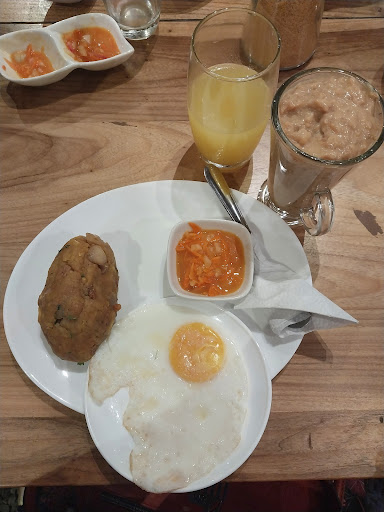 Muy bonito lugar escondido en un rincón de esta selva de cemento que se llama Portoviejo, nunca lo había escuchado, su ambiente excelente con ese diseño campestre en cuanto a su construcción en caña y madera, la cocina es abierta se la ve que cumple con los estándares de calidad con todo en acero inoxidable, la tención muy buena están atentos con una carta bien comprensiva y detallada, un menú variado. En cuanto a la comida el Bolon chicharrón y queso junior para mí fue suficiente, mi hermana pidió un "normal" que es súper grande el sabor excelente, suave y abundante contenido, el pan de almidón sabor normal pero suavecito, la empanada de cerdo tampoco me deslumbró en mi casa no me gusta el huevo duro y las pasas en la comida 😞🫣 y este tenía esos ingredientes, la tortilla de maíz super suave pero le faltó colocar más queso o en este caso que sea un queso duro o un poco más viejo para que le dé más sabor y no se pierda con el maíz, el ají espectacular, me hizo recordar a los buenos tiempos de la cafetería Jean Pierre. En fin 100% recomendada volveré para probar los otros productos, ah por cierto el café delicioso y sin...