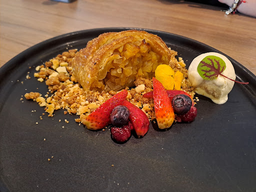 But the showstopper? The vegetable paella. Served in a rustic black pan, it was a visual and culinary celebration—roasted cherry tomatoes, grilled asparagus, yellow carrots, shishito peppers, and a charred onion flower in the center. The socarrat (crispy bottom layer of rice) had the perfect texture, and every vegetable was roasted to perfection. It was a dish that tasted like it came straight from the earth and landed in a Michelin-level kitchen.