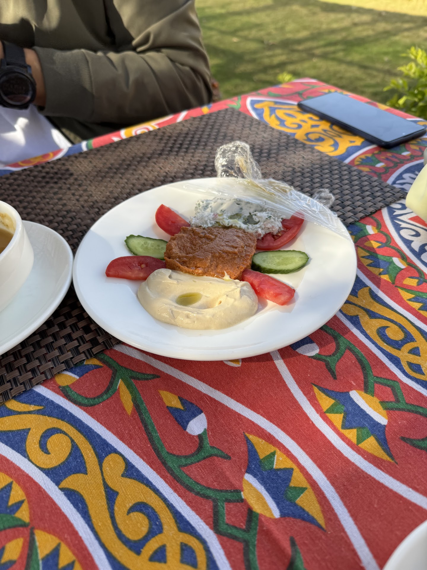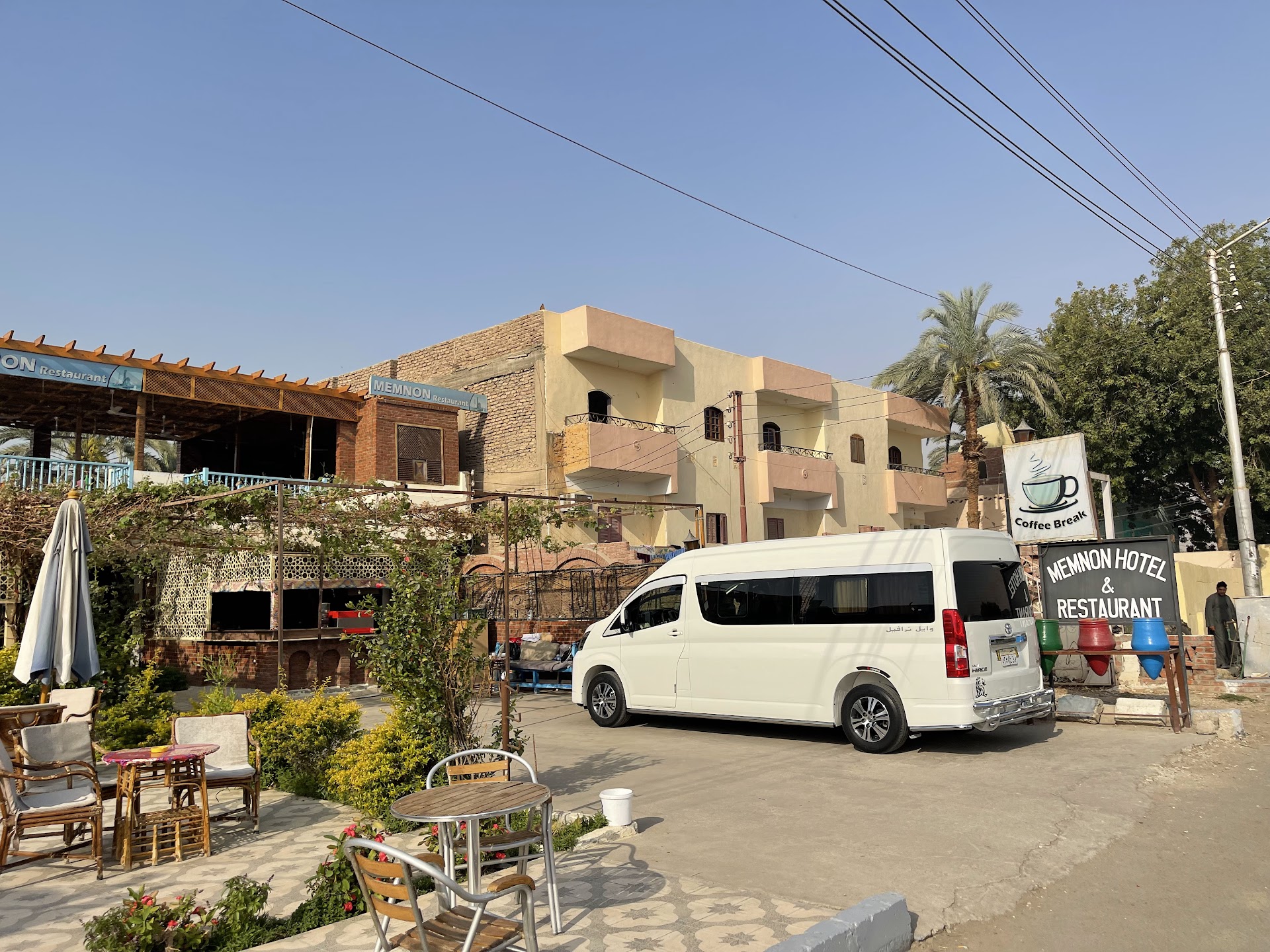 Tours was a nice place to stop and visit between events. The staff was kind and helpful. The bathrooms were clean and stocked. We brought much of our own food but we ordered drinks and tea which was delicious. There is free Wi-Fi here as well. The outdoor seating area was well constructed and clean with enough seating for forty or so people. Across the road are the Colossi of Memnon which were nearly destroyed in an ancient earthquake. The Colossi once “sang” at dawn and dusk and the sound had many ancient explanations but was likely due to the temperature differential at those hours moving air thorough cracks in the facade. This all came to an end when a visiting Roman Caesar “honored” the statues by giving them a facelift. The repair immediately stopped the singing but the Greek name associated with one of the explanations associated with Agamemnon stuck, so they remain...