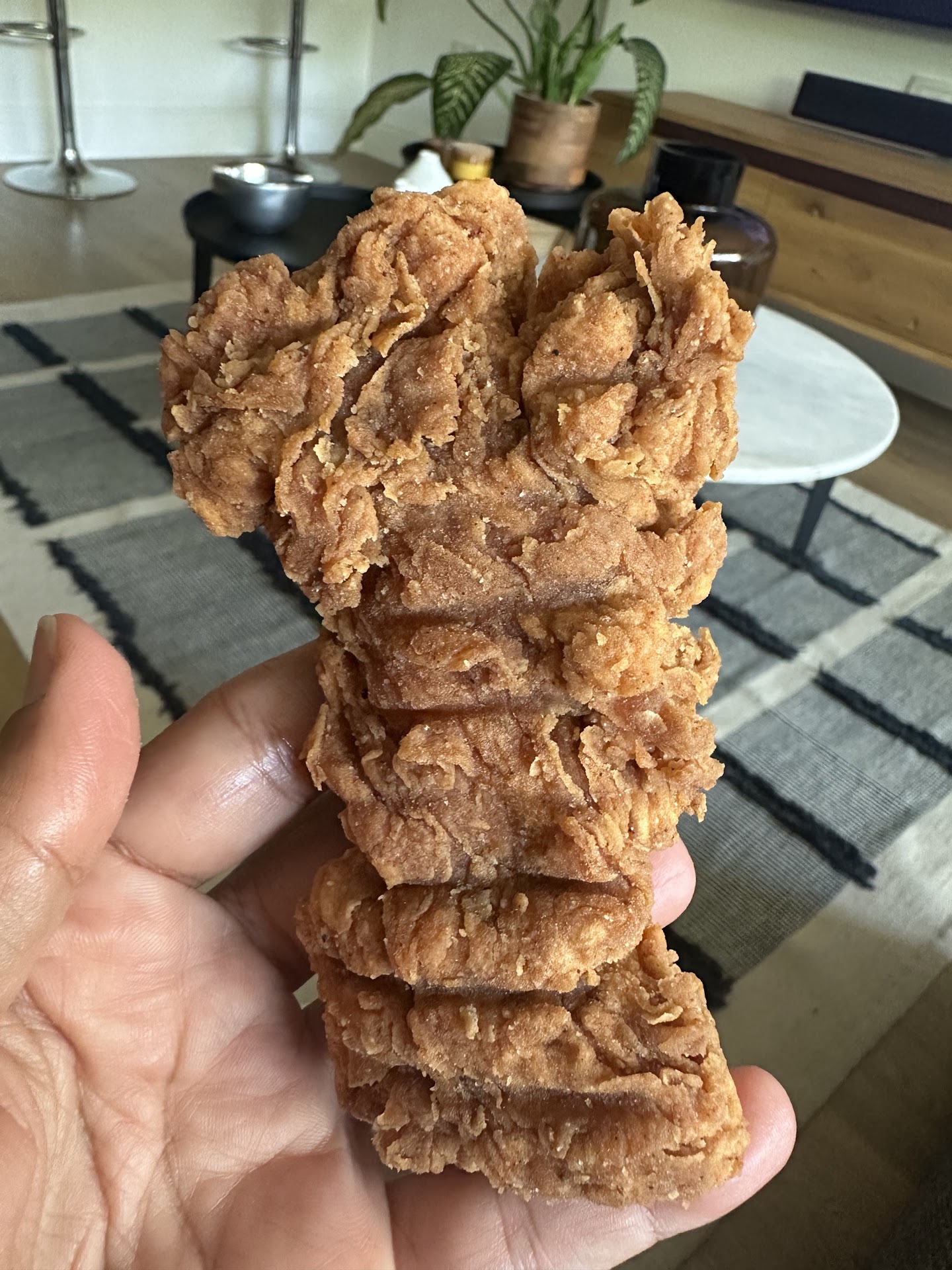 I ordered five chicken tenders, a buffalo sandwich, and a ranch sandwich. The chicken tenders looked big but had very thin chicken inside and a lot of extra, unnecessary breading. They were also hard (not crispy as they should be) and didn’t taste fresh, as seen in the pictures below, from only two chicken tenders.