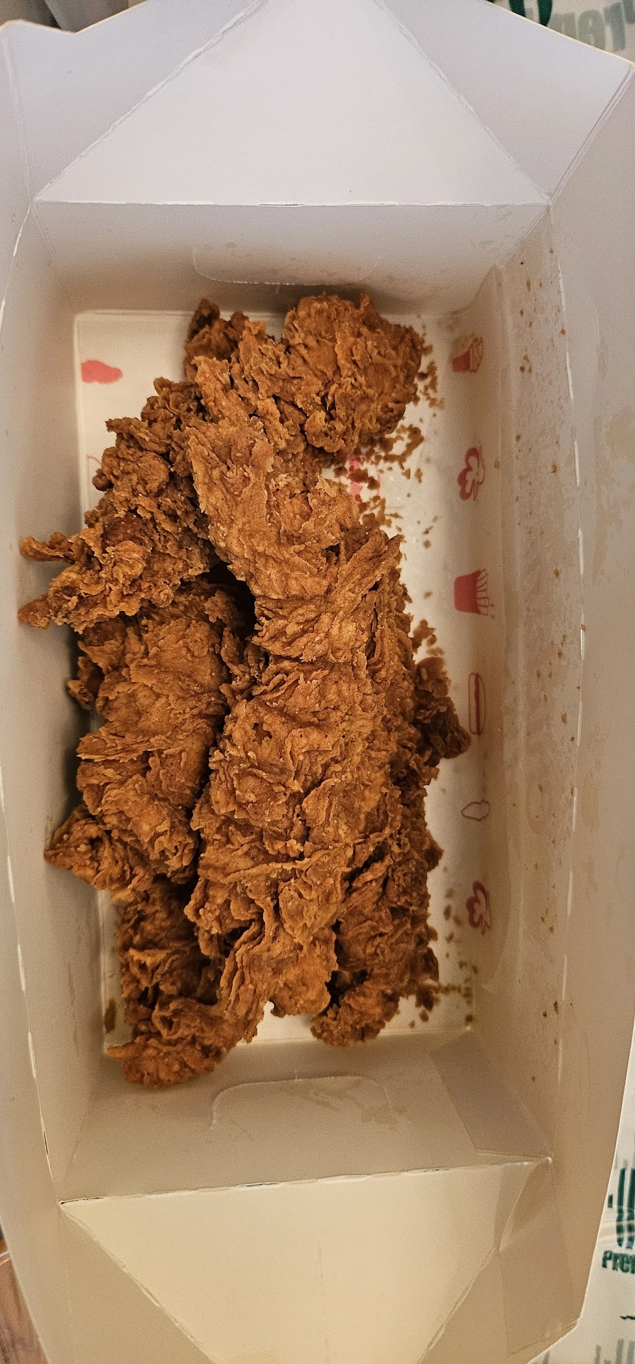 I ordered five chicken tenders, a buffalo sandwich, and a ranch sandwich. The chicken tenders looked big but had very thin chicken inside and a lot of extra, unnecessary breading. They were also hard (not crispy as they should be) and didn’t taste fresh, as seen in the pictures below, from only two chicken tenders.