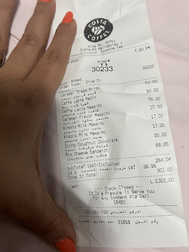 Read moreToday I went with my family for a quick to go coffee at Merghany branch the cashier named Ahmed Ali was VERY rude he asked me to pay 10 pounds extra than the actual receipt which I thought was part of the amount due only to see him putting those 10 pounds on the Tip mug!!! I got shocked and when I asked about the receipt and protest he got aggressive and told me that I’m the one who didn’t hear right ! Although the next client who witness said that the cashier asked me for 310 pounds not 300!! And after all that he didn’t put the rest of my order on the counter to be taken abd what did the manager do to all that he was pushing the worker back and continue to nod his apologetically but it seems he is not respected enough by the stuff ( I wonder why?!) Been customer for more than 12 years feeling sorry for the bad agents...
