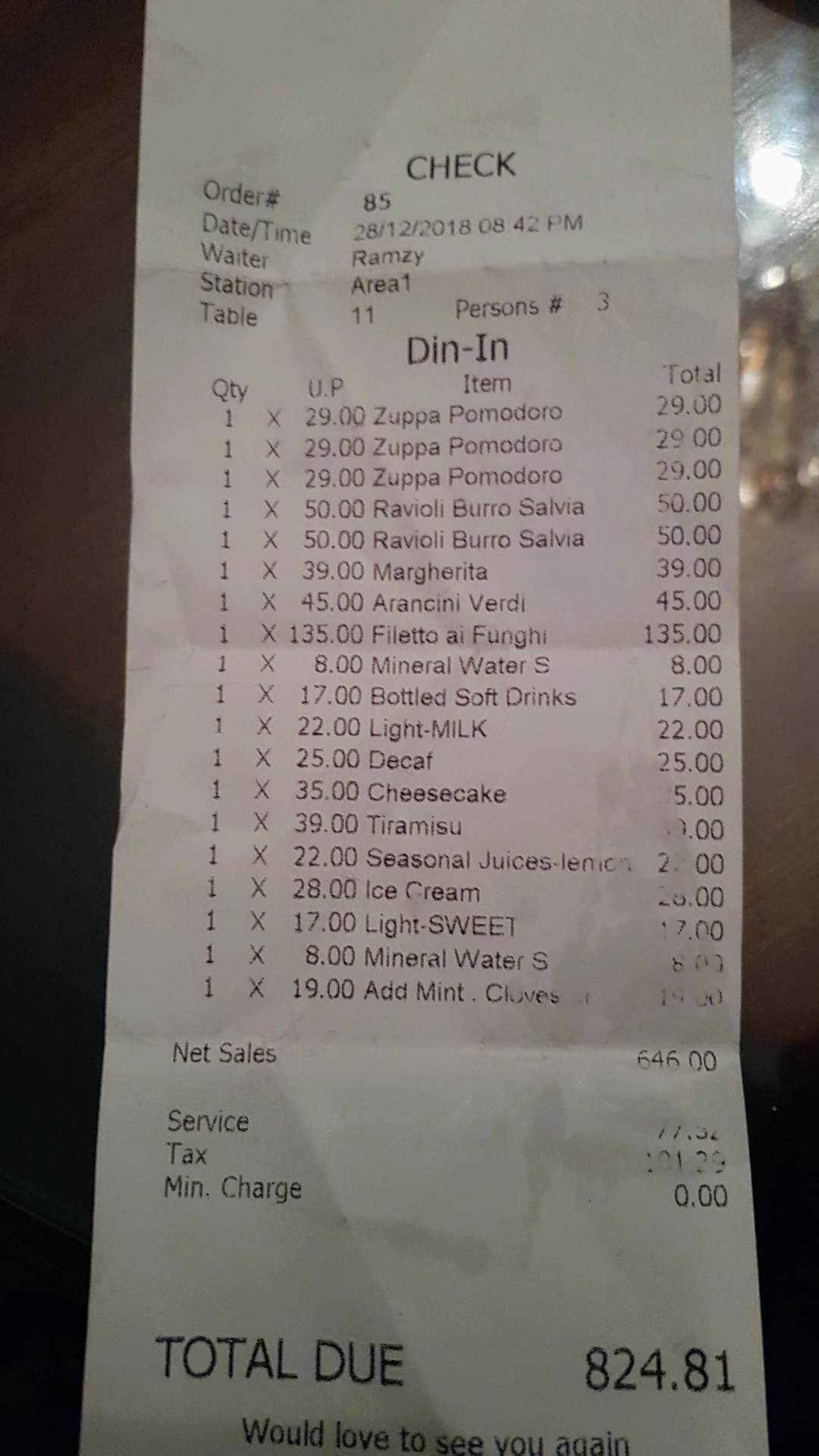 Then came the mains, two ravioli, one pizza and a fillet. They quickly took the soup bowls and no one questioned why the bowls were left half full.