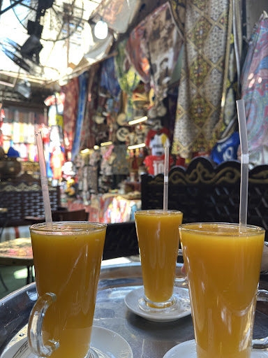 The café is always buzzing: lanterns hang from the ceilings, mirrors line the walls, and the chatter of tourists and locals blends with the sound of oud music drifting through the alleys. Service is quick and old-school — you order tea, mint, or a Turkish coffee, maybe some Egyptian desserts like basbousa or konafa, and just soak in the energy.
