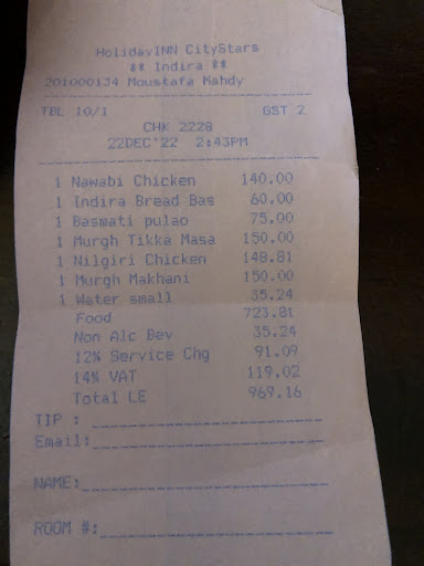 It's a small restaurant inside City star mall with the following access to Holiday Inn hotel for the residents. The atmosphere and interior conforms to the standards of a 5-star hotel, though the staff wasn't speaking good English and couldn't deliver proper clarification to certain dishes In the menu. The food was fine but too spicy for us, given the fact we requested it to be not spicy. We ordered dal makhani, shrimp biryani, vegetable biryani, masala paneer, jalfrezi chicken, samosa and Nan garlic bread. The prices are considerably higher than in other places but can be understood as dinning in the hotel's restaurant. At last, the variety of dishes were limited in my taste and lacked other dishes like chicken curry, any of the paratha, or coconut ice-cream. Instead, the menu was filled with many grilled dishes. After completing our dinner, my sweet tooth couldn't find any satisfactory desserts. Despite the nice atmosphere they offer I wouldn't repeat my...