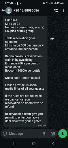 Read moreThis place looked nice from the outside, good music and people seemed friendly but when it came to the time to pay the bill, they charged us twice on two separate terminals and refused to present a void transaction for the first terminal. Funds have now been deducted from my wife’s account twice for the same transaction. They also charged us £500 (Egyptian pounds) or £25 UK equivalent for a bowl of nuts that we didn’t even ask for. The stale nuts were placed on the table and appeared to be free but then showed up on the bill as ‘open food - 250.00’ (for which we were then charged twice) The three cocktails we had tasted watered-down and were highly overpriced. When we complained about being charged for food that we hadn’t ordered, the arrogant Manager (a blonde lady who refused to give me her name - just a card with a number on it) said that she would not refund the money. Overall a horrible experience that spoiled our...