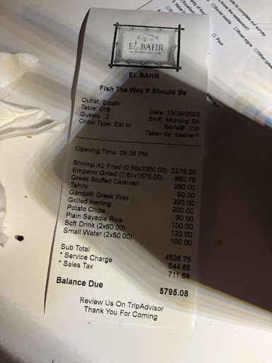 Read moreThe restaurant was fully closed with glass so with 27* outside we felt a little bit like tomatos in a greenhouse. We asked white wine, Jardiniere du Nile, witch was on the menu, but they could only serve that in half an hour because they had to go and buy it first. Then I wanted lobster, witch was on the menu, but they did not have that. ( in a FISH restaurant, of all places!) Then the boss said he had BIG crabs, so I ordered that. The crabs he served had like 10 grams of crabmeat!!! I think he never saw a big crab in his life! The crab was served without a tool to crack the scale or to get the meat out of the legs of the crab. Also no moisten napkins to clean your fingers after eating. The entree, sea food kofta, was good and the seafood tajin also was good. But for the crab they asked 840EGP/kilo. 84EGP/kilo would have been a more correct price! So never again will I go there! 2073EGP...