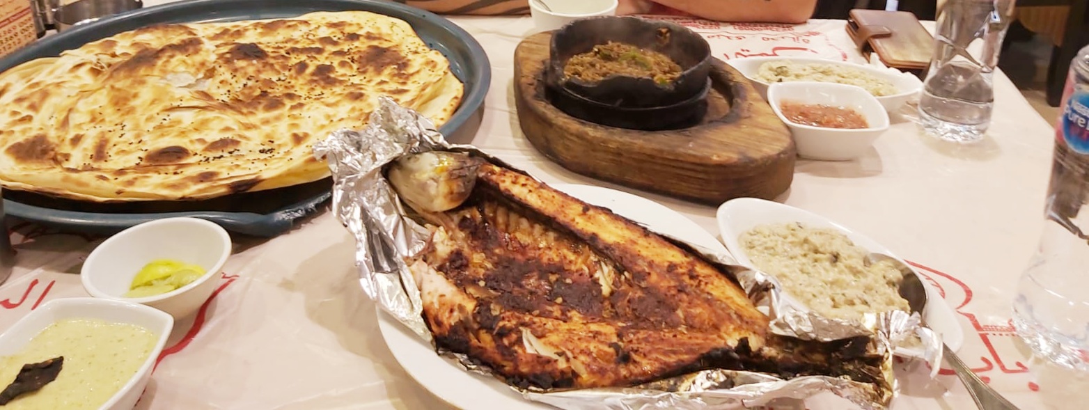 We had a fish dish which was very pleasant indeed. Due to people raving about it on reviews here, we also ordered the beef fassah (excuse the spelling). The portion was tiny, barely covering the bottom of the tagine dish. There were around 8 small shards of sharp bone in my tiny Portion as well as a good amount of fat, ligament and vein. The bread, as you can see from the photo was enormous, fresh, warm and delicious, the fresh baba gnoush was also excellent.