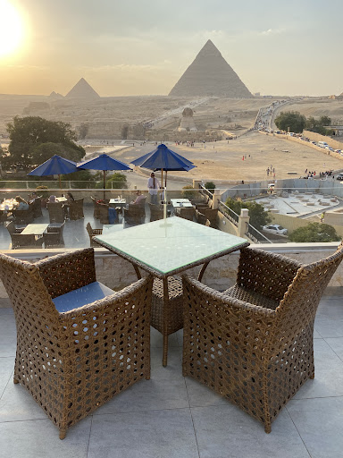 This place gets 1 stars for food and service. We came for dinner to take advantage of its location to watch the pyramid light show - which location wise it is perfect so the 2 star is for that aspect. When we showed up, there was only one other table with 2 people. There are 2 decks on the roof that you could choose to sit at. Their menu is large (with English available) but they told us they only have chicken and pizza available. So my fiancé and I ordered a pizza and a chicken dish and bottle of water. It took 1 hour before they brought us the water and told us the food would be out soon. It took 2 hours before we received our food. Food was nothing special that we needed to wait 2 hours for. We were freezing on the roof as we were there for nearly 3 hours and it was extremely windy and there were no heat lamps. There are nearby rooftop restaurants that look much better than this so go elsewhere. I wanted to give this place a chance despite it not having many reviews but after visiting this cafe, I would not recommend it. (If you’re a interested in coming for the view, the Cleopatra is literary right next to this place with also a roof deck and looks much more lively than this place and hopefully they have better service...