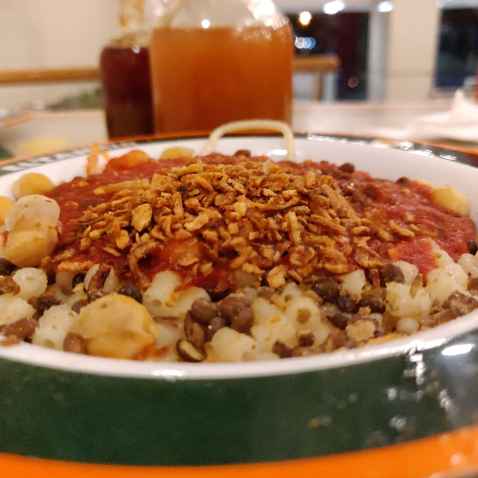 You may find it surprising that Koshari is very popular in Egypt and 100% vegetarian. About Al-Tahrir koshari ، it is a small place which is extremely crowded, we had to wait for sometime to get our table . The service is fast, like really fast. Our food was out in less than 5-7 minutes of ordering. It is not really like eating street food because it is a sit down place which looks "relatively" clean. We didnt have any stomach issues after eating here, so worked for us. There were 2 sauces to add to the Koshari, the Lemon and garlic sauce and the spicy sauce. The Spicey sauce at this place is awesome extremely hot one so be careful if you are not a fan of hot hot chilis . I added a lot to my meal and enjoyed cleaning my plate 😂.