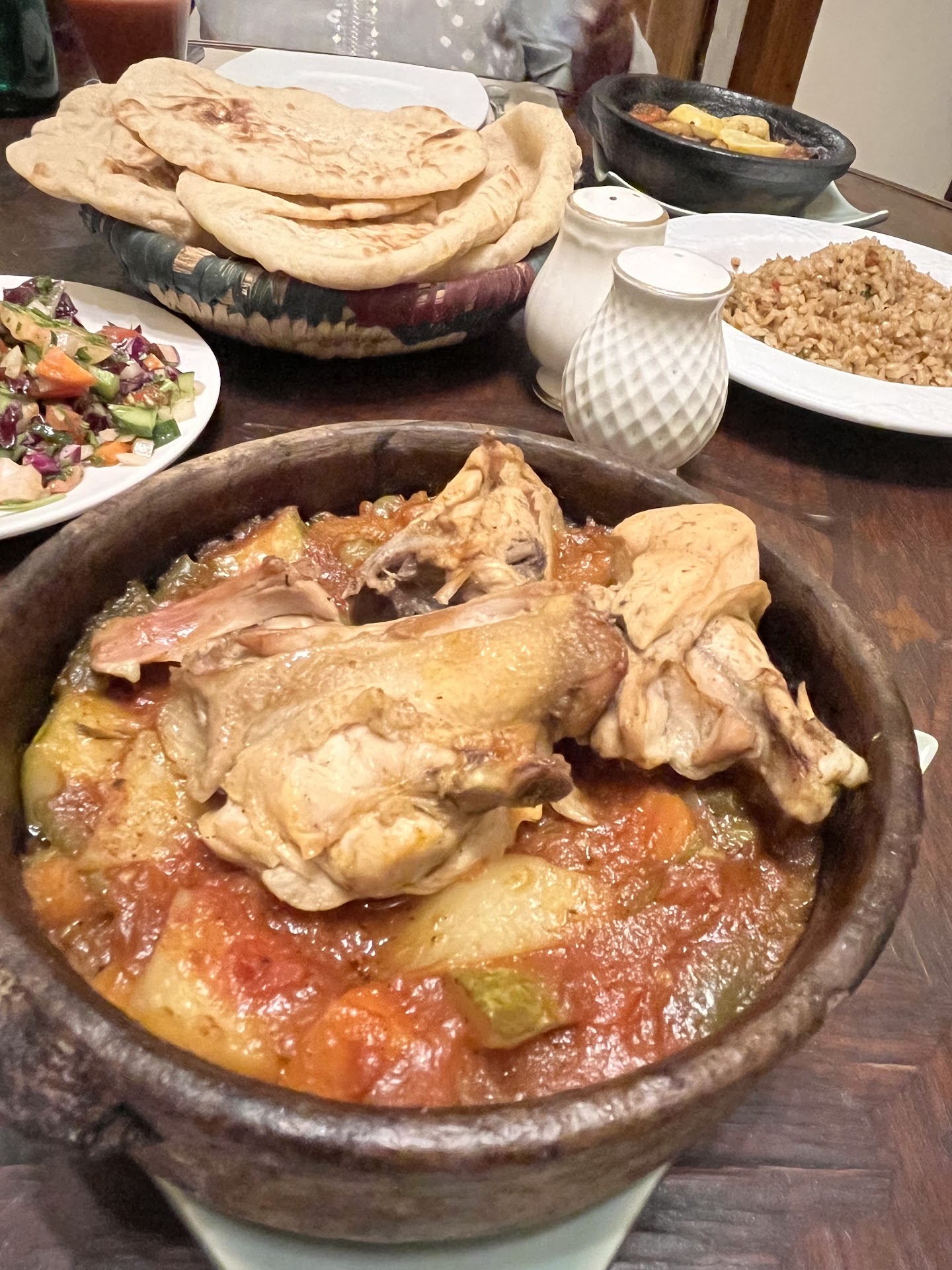 After deliberating, we ordered Koushry (25LE), Tagin Ramya Bil Mozza (75LE), Hamam Mahsi (50LE), and Karkade (14LE) at 6:54pm. Karkade came at 7:04pm; mains arrived at 7:10pm.