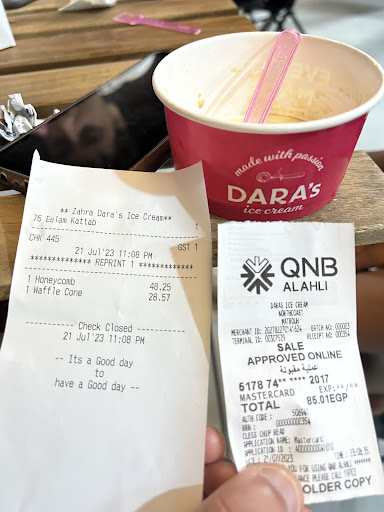 Read moreFaced today with a weird situation @Dara's @Northed Zahra. The Cashier asked me for a 85 EGP yet he refused to give me a receipt!! I insisted to receive the receipt and once handed to me I found a receipt for only 76.82 EGP and claimed that the rest is tax which even doesn't make sense. If we even added a 14% VAT the total won't be 85 EGP!! Shame on you...