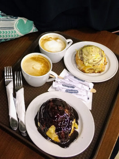 Counter-serve chain serving cinnamon rolls plus other baked goods & specialty frozen beverages.
