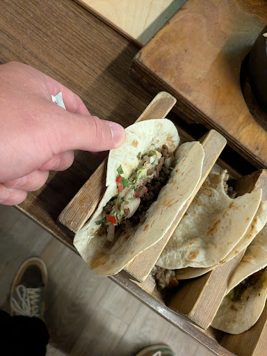 The Tacos, however, were also disappointing. They were almost empty, served cold, and bland in flavour. The bare minimum expectation was for the "cheesy beef tacos" to at least have some cheese in them (see image). Finally, the Camel Steak arrived. The hot stone was brought to the table with a nice-looking cut of steak. This is where things became very strange. The waiter put a bib on my partner and then decided to cook the steak himself, unfortunately butchering it in the process. Despite asking him to stop three times, he continued until another diner intervened in Arabic and told him to stop. By then, the steak was cooked well done. We very clearly requested a rare steak.