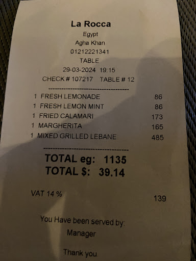 Read moreSo. After one problem after solve all by owner we came many times. Food is ok climat and place. ButâŠâŠ prices is a to high. This is opinion all of our friends who visit with us this place. In Hurghada when we was visit other restaurants the prices was even half then LaROCCA. SO. Mostafa. I think You have to think about this. But anyway thanks for solve the problem. đ€next visit after 6 months. Service much better. All much better. Thanks and See...