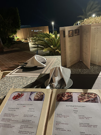 In the premises of Hurghada Marriott Hotel, stands Tuscany with the beautiful view, we sat in the open air area, for dinner, surrounded by the lighted greenery and palm trees with boats and yachts reflecting lights on the sea with lovely Italian music and songs in the background. .. Each of the five of us had a different dish; grilled salmon filet, veal escalope, ceasar salad, beef filet with mushroom sauce, pizza quatrostagione , penne arabiata and sea food risotto .. Served hot and looking gorgeous .. beautifully styled dishes.. The waiters were friendly & prompt, Nasief and his colleagues and when we complemented the delicious food, Chef Hossam came to greet us.. A young Egyptian chef specialized in Italian Cuisine… We had ordered a cake from the Hotel Main Restaurant to celebrate a birthday and were enchanted by the waiters ceremonial singing as they brought the strawberry sponge cake.. At Tuscany we felt that we got our money’s worth plus of service, high quality food with ample portions in a beautiful ambiance.. Thanks to all for a...