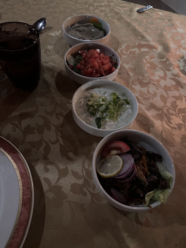 Read moreThis place was excellent. Very delicious food - so delicious I forgot to take a picture of our main course. Well worth the visit if you would like a quiet/ romantic dinner. We started with cold mezze and veggies and then moved onto the main dishes. We had Tarb- which is spiced minced meat over a grill, the rice Khalta was delicious, Hawawshi is a bread - think pita- stuffed w minced meat and spices and Mumbar which is casings stuffed w meat and rice.