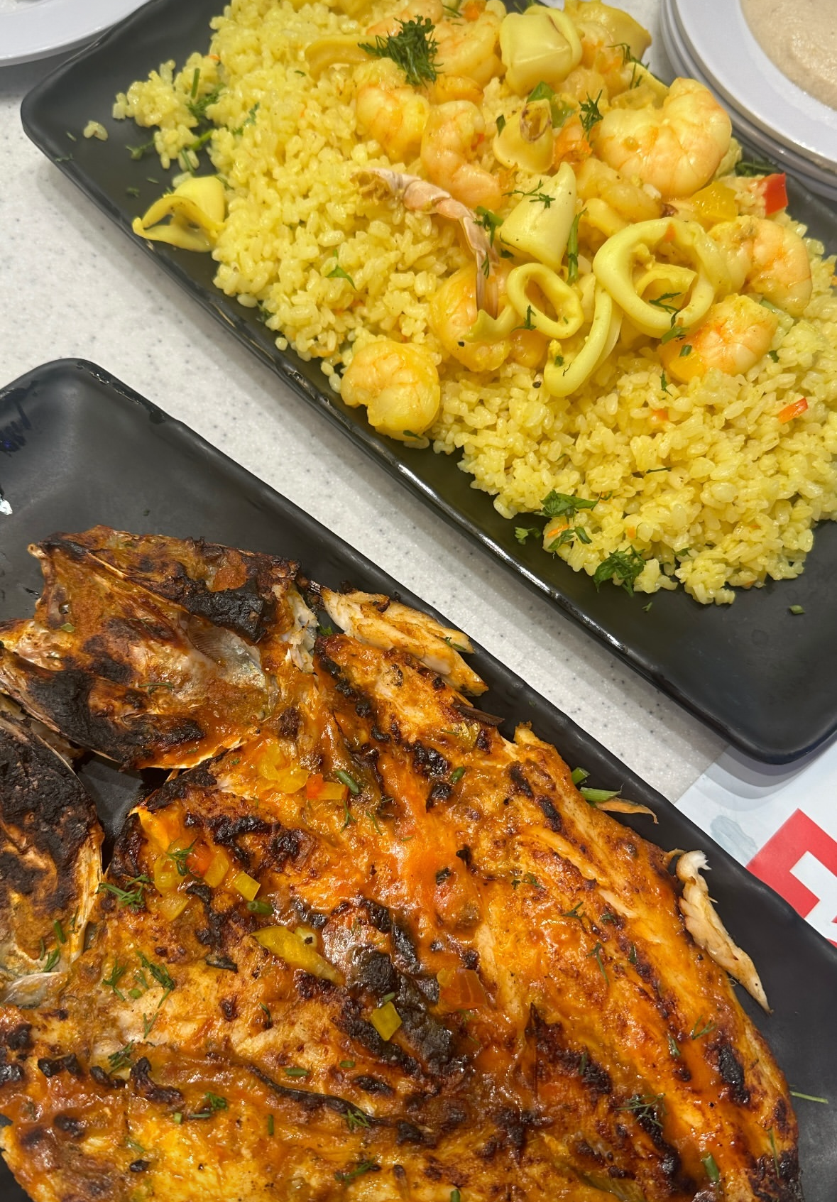 If you are unsure of what to pick on the fish counter you can say how many grams you want to eat or how many people you are or how many will be eating the whole fish, and the guys at the counter can direct you to get an appropriate size fish. I didn't see any fillets there just whole fish in different sizes. We personally like grilled white fish and it was enough for 3 adults! I also highly recommend the yellow rice that has the calamari, baby crabs and shrimps, i personally didn't eat the calamari but the shrimps are delicious and the rice is very buttery and soft!