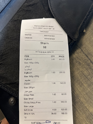 We had lunch in Manny's Burger in Sharm el Sheikh in June. The prices on the bill were not the same as agreed. Food tasted quite okay (Texas Burger and New York Burger (the last mentioned too heavy on the meat). We ordered a special order of curly fries with bacon and cheese, really tasty, but the final price changed.And fresh mango juice ( 40 g on the menu, 55 on the bill). When complaining about the price difference, they commented " it's only 30 pounds difference". My daughter who's a student considered the price difference unfair and too big. Service and food were good, but cheating no. It was very quiet in the diner, jus us two persons and one family. We paid the bill with the extra 30 pounds, but anyone going there, please check the...