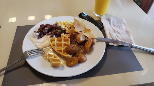 Excellent food and staff. If you don't want the buffet, there are menu items here. The morning you can get fresh pupusas or omelets, there's always a great assortment of vegan options as well. Portion sizes are generous from the hotel menu, and if you leave hungry from the buffet, that's your own fault! They do a great job of trying to mix things up from time to time as well. Their Thanksgiving meals and Christmas meals were excellent. The service is second to none. If you're not great at speaking English, most of the staff is fairly bilingual and you can still accomplish your order without any issues. Definitely recommend this restaurant if you're...