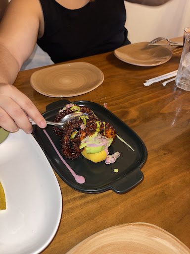 The food was amazing! I knew the food was going to be great by the comp plantain chips and the sauces they provide. I thought to myself that if these sauces, taste this good, the food must be even better. Their causa de lomo saltado rivals any I have had back home. The potato was moist yet sturdy, the lomo had a great smokiness to it and was nice and soft. I also ordered the risotto with pulpo a la parrilla. I will comment that what you serve, is not risotto, as the grains were different, the consistency was off and it was very cheesy. However, it was still very tasty I was just anticipating something specific. The pulpo on this dish however, made it worth it. We also had the ceviche which was very delicious as well.