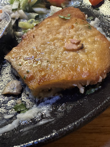 Порция большая, тут похвалить можно. Шницель лежал поверх пюре. С краю салат и пиалка со сметаной. Хочешь отрезать кусок шницеля как из под него вылезает за края тарелки пюре. Но на это глаза закрыли. Разрезав шницель понимаю что это просто гретый кусок подошвы. Позвала девушку, уточнить. Гретый или все же свеже-приготовленный. Сказала что готовят как говорится из под ножа и убежала. Подумала, что я слишком придирчива и начала дальше пробовать. Начала есть, и понимаю что есть его просто невозможно. Настолько жирный шницель, что вся панировка пропитана маслом. Мясо внутри сухое, трудно прожевывалось. Масла столько что передергивает от воспоминания.