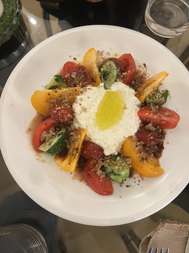 I really enjoyed the tomato salad with lemon ricotta; The pizza was nicely done and the tomato sauce was packed with flavour ; Chicken tacos were real crowd pleasers - the meat was soft as butter and the flavour combos worked well; For dessert we tried the baked bread dish with crème anglaise - unfortunately it was a bit dry and just not that enjoyable of a dish.