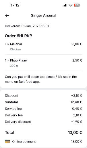 I drove to the restaurant to return the food, which was untouched, but they refused to refund me. So, I ended up paying €13 for food I didn’t eat or keep. This is extremely unprofessional behavior. Avoid this place...