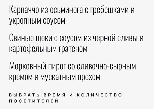 Меню- у нас оно было конкретное , то, что предлагало мероприятие и то, что мы хотели попробовать Все было вкусно , к еде не было никакой проблемы , единственное , гратен в основном блюде я заменила бы на классику (например , пюре) , но это лично мое предпочтение. А так меню было восхитительно , повара молодцы