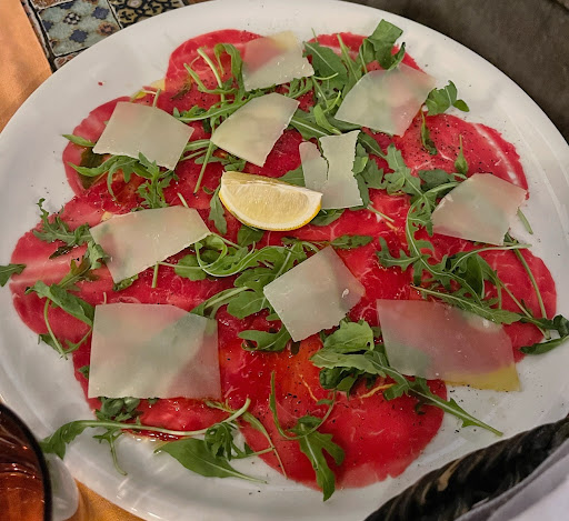 Food. We ordered grilled beef ( Bistecca di manzo) and spaghetti carbonara (Spaghetti alla carbonara alla Controvento). Beef was cooked as ordered (medium rare) and tasted really good, but really thin cut of beef. Side order was for extra cost but that's common these days.