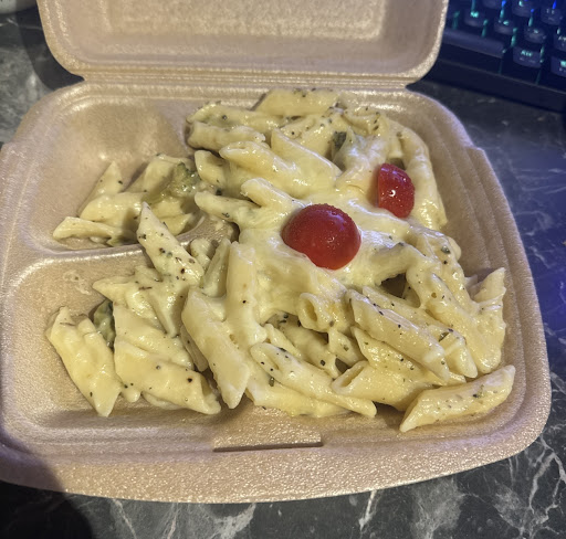 The “mac and cheese” is just penne pasta, not mac and cheese at all, the so-called “side of honey mustard sauce” with the cheesy jalapeños seems to be just sweet chilli sauce. Maybe the kinda funny but misleading photos are on purpose.