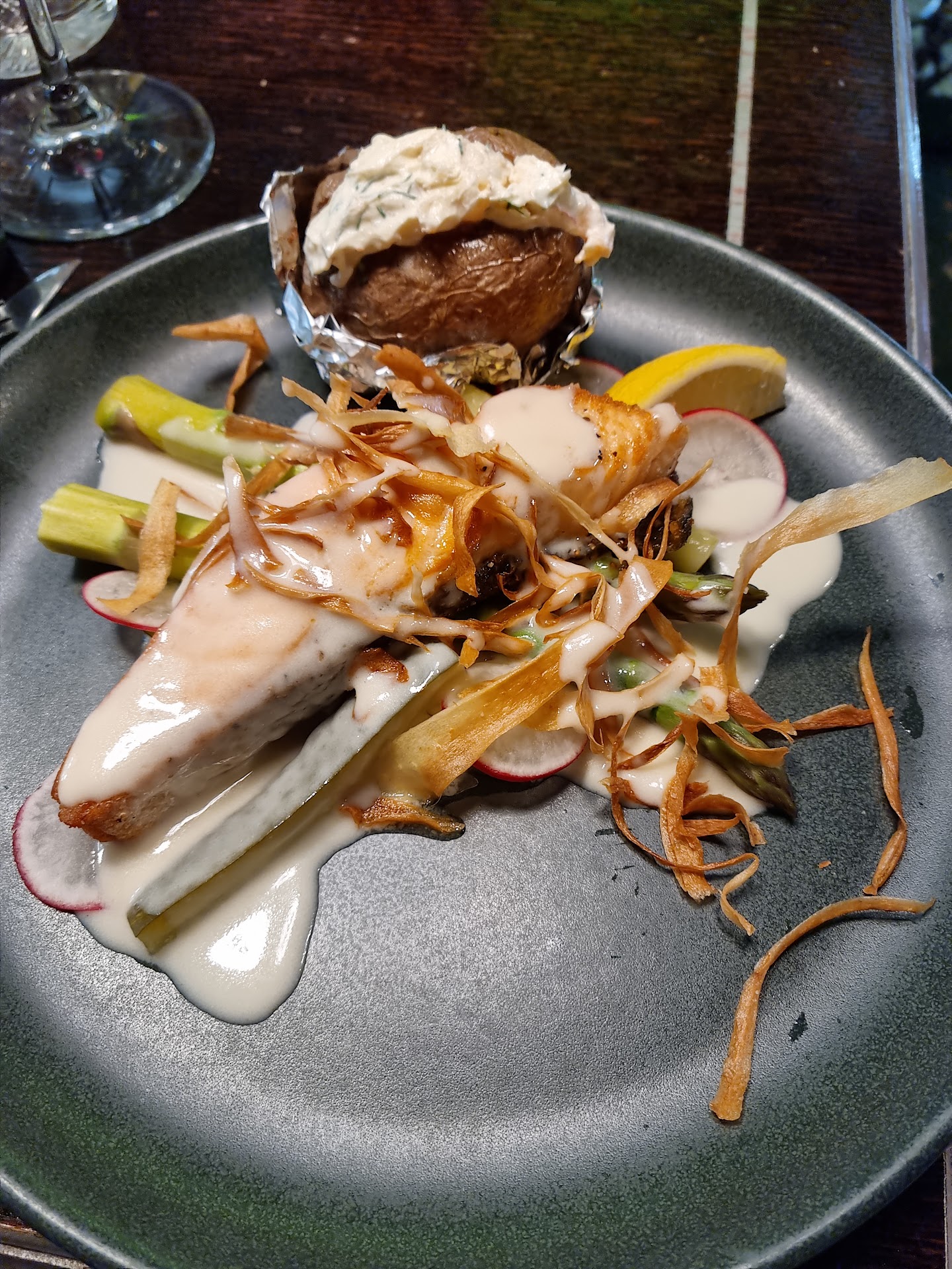 Read moreThe food was tasty very well though of, and there was live music which is always a bonus -- but for a place that invests a lot in the atmosphere - the general atmosphere was very unpleasant. There was a fish tank above the stage, lit with bright lights so you couldn't not look at it, and it contained many huge fish swimming in a small confined space. That just made me sad. The staff was unwelcoming and acted like they were doing me a favor by letting me in. They answered questions in mono-syllabic sentences, looked away while talking to me... Generally the place felt off. Wrong vibes. I couldn't wait to finish my food...