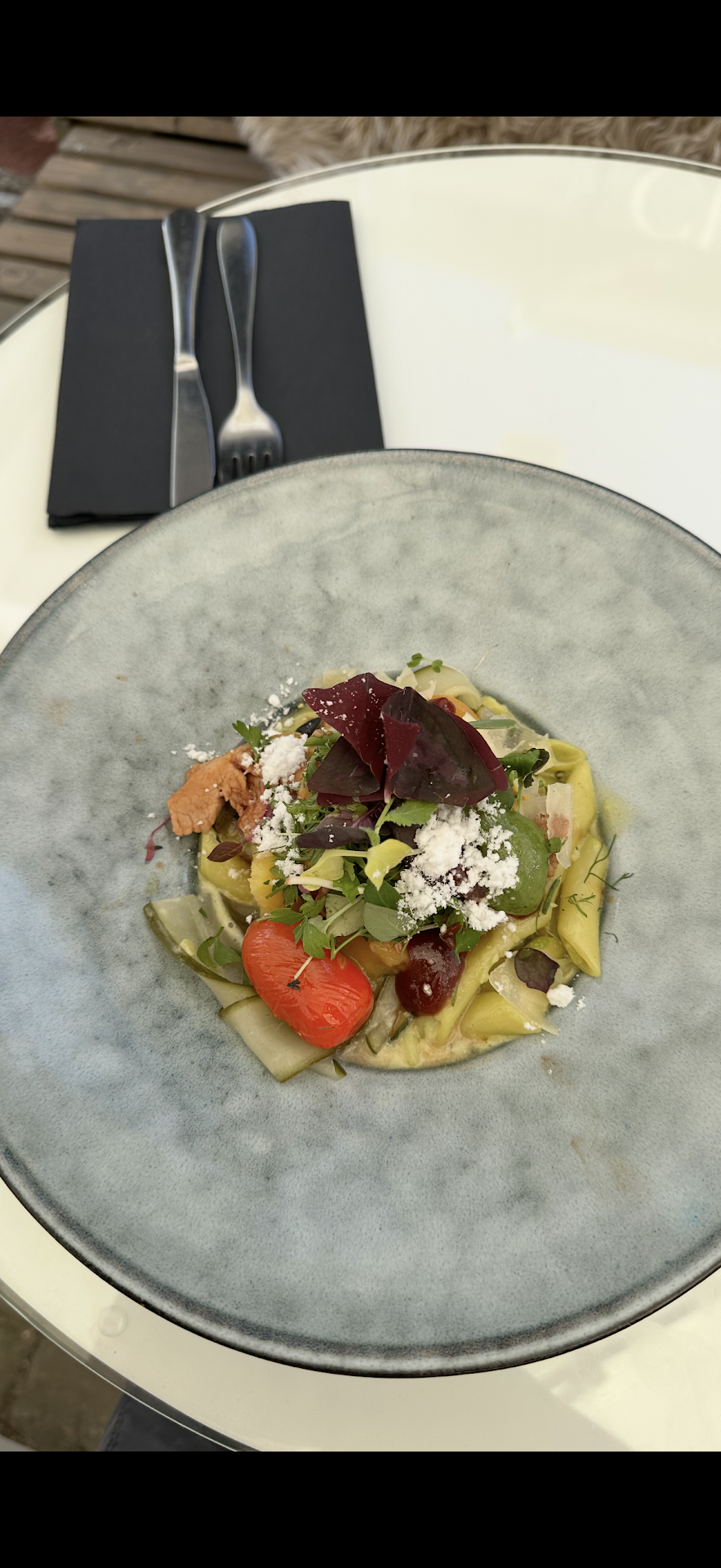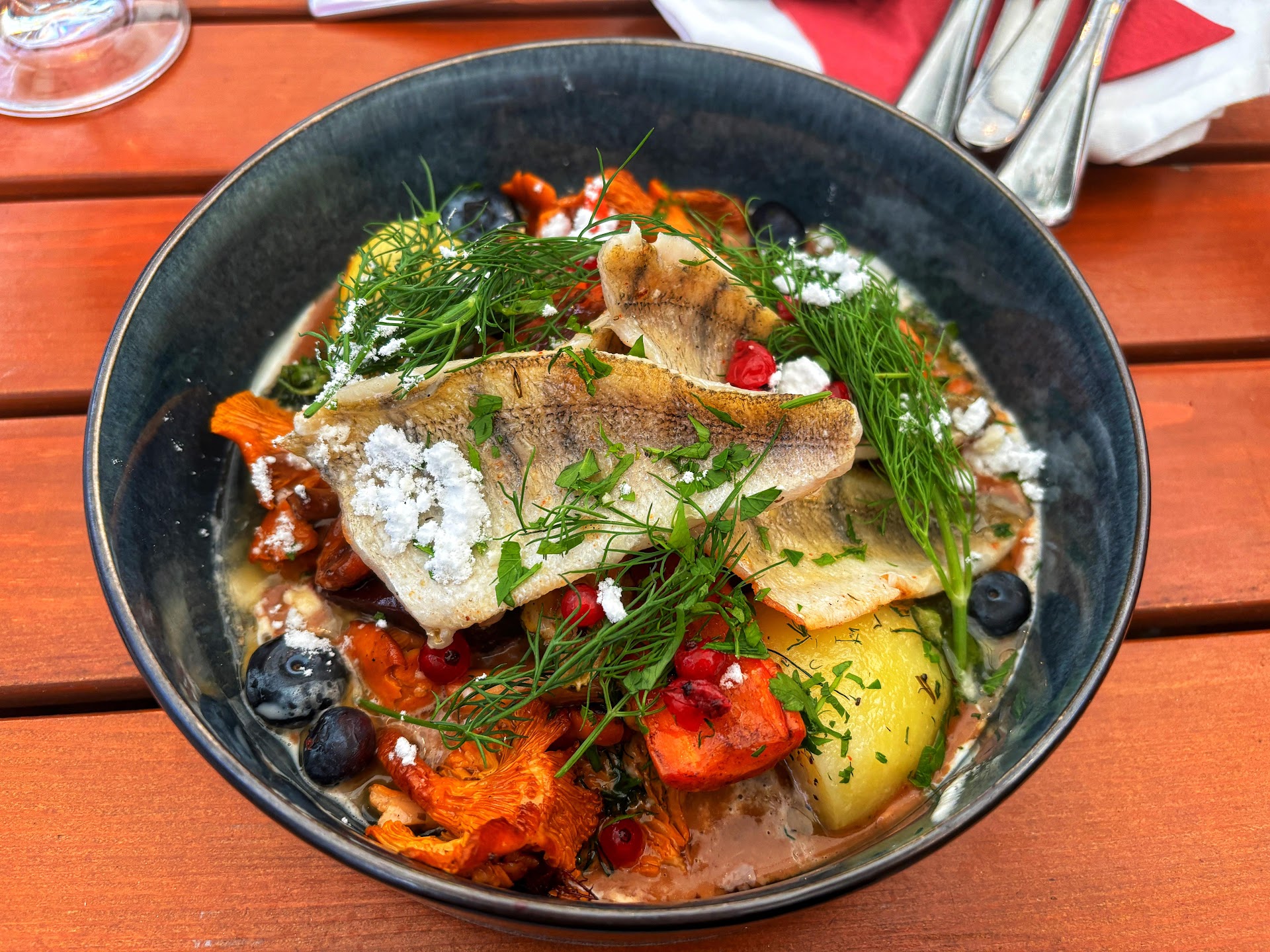 The food was prepared on the coal grill outside, just in front of us and it was seasonal, local food. We had european perch, which was grilled perfectly, alongside with a chanterelle sauce and grilled vegetables, as well as the pork tenderloin alongside some grilled vegetables. The tastes where perfectly balanced and we really enjoyed it. The deserts are also worth mentioning, if you don't find something you like in the menu, take a walk inside and there is a whole bunch of different cakes available. Overall, this place is a hidden gem for people who enjoy good food and care about the quality and sustainability...
