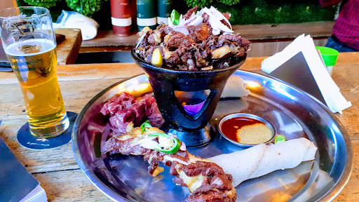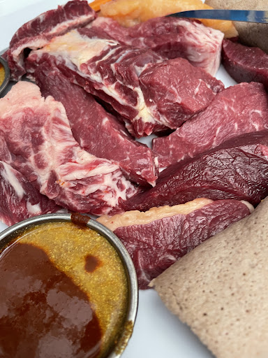 The grilled meat is served with raw cubed steaks, a healthy helping of injeera and a delicate spice that gives you the same sensation as wasabi.
