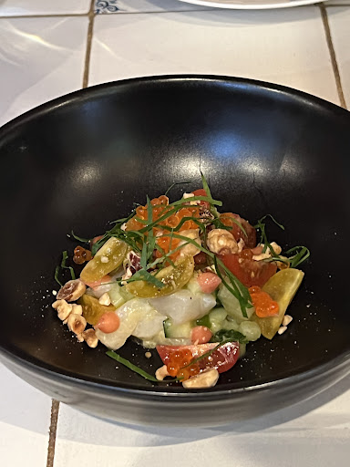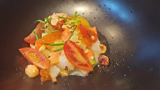 The meal opened with capelin and horse mussel pintxos, served on squid ink toast, with pickled Spanish chili and garlic aioli. A bold but balanced start. That was followed by a beautiful ceviche with the fish of the day, presented with tomato, cucumber, daikon and trout roe - fresh, crisp, and acidic in all the right ways.