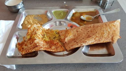 They offer a variety of (mainly) South Indian dishes like dosa, thali, pongal, medhu vada, uttappam, pulao, raitha, kudamilagia, puri, upma, sambar, rasam, payasam, chutney, sambar, tea, coffee and seasonal fruit juices.