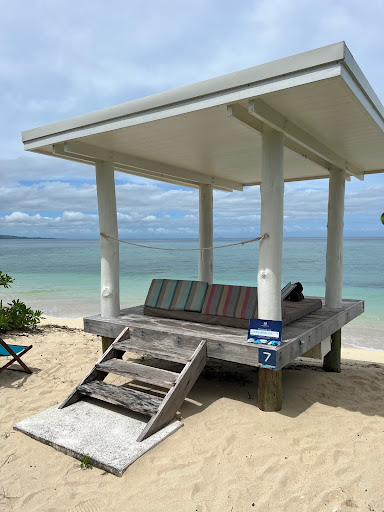The food and drink menu is extensive, well priced and of a very high quality. We ordered sliders, the fisherman's basket, yellow fin tuna poke bowl, chocolate brownie, and a range of drinks from fresh coconuts, to very strong cocktails, slushies, and of course Fiji water. The personal service and attention to detail really stood out, such as the Fiji water being brought in a cooler bag filled with ice and two glasses to ensure that everything was always ice cold.