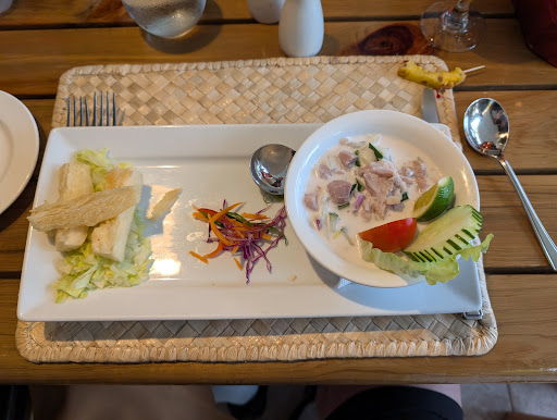 The meal started with virgin pina coladas. Very nicely done and tasty. We also had the Fijian raw fish (seviche) and the seafood chowder. Both were very nicely done. The chowder was massively loaded with seafood, and unlike what we are used to, lacked potatoes. They were not missed. Two of our party got the surf and turf. We usually like our steaks medium rare, but have learned that ordering it rare in other countries works better. The steaks were delicious and tasty, as was the shrimp.