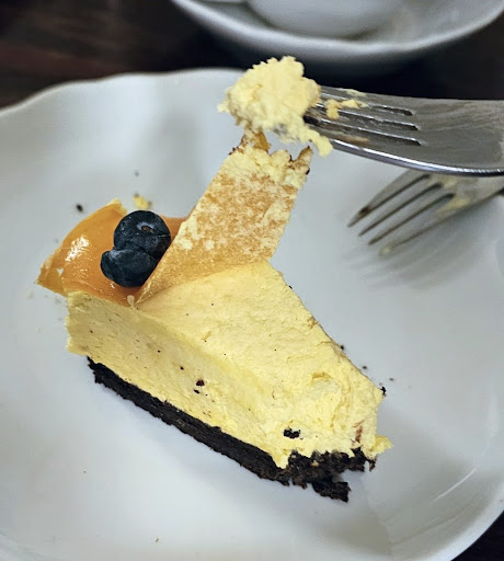 I read previous reviews mentioning that the cakes here were good, so I ordered a mango cheesecake. It was surprisingly bad! It was quite obvious that the cake had been sitting out for a very long time. The top layer was supposed to be a supple mango gelatin, but the texture was rough like a dehydrated fruit. The cheesecake component itself was very dense, dry, and crumbly. The bottom layer of the crust was hard. It was very difficult to cut through with my fork. After my first bite and having other people at my table confirm my observations, I ended up sending it back to the kitchen. For the price (it was nearly 9€) it was definitely not worth it!