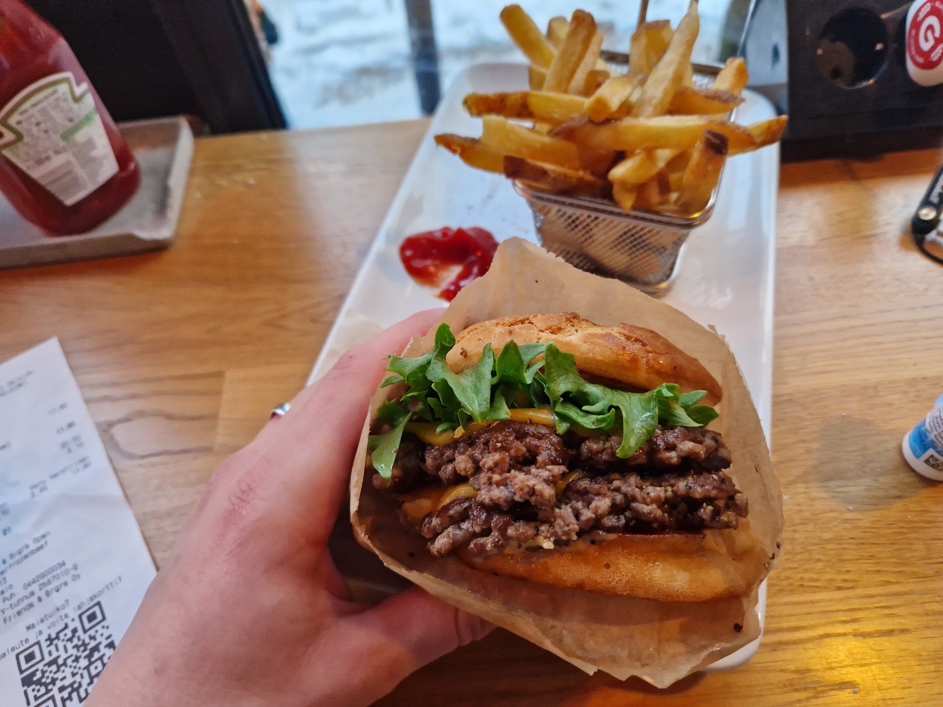 Friends and Burgers is a burger restaurant in middle of Helsinki, right next to railway station. You enter the restaurant from ground level through quite steep stairs to find yourself in an open and light restaurant environment. Big windows give you a great view to the nearby railway station plaza. Inside the dining area you can see through glass windows 2 areas, one is the always busy kitchen and one is where they ground the meat. The orders are done through single checkout cashier and menus are available in Finnish, Swedish and English. After ordering you are handed out an electronic bleeper that will alert when your food is ready, which you will go and pick up from the kitchen's open window. After dining, the cleaning is done as self-service by taking the dishes to the drop-off point. You can also order the food as take-out.
