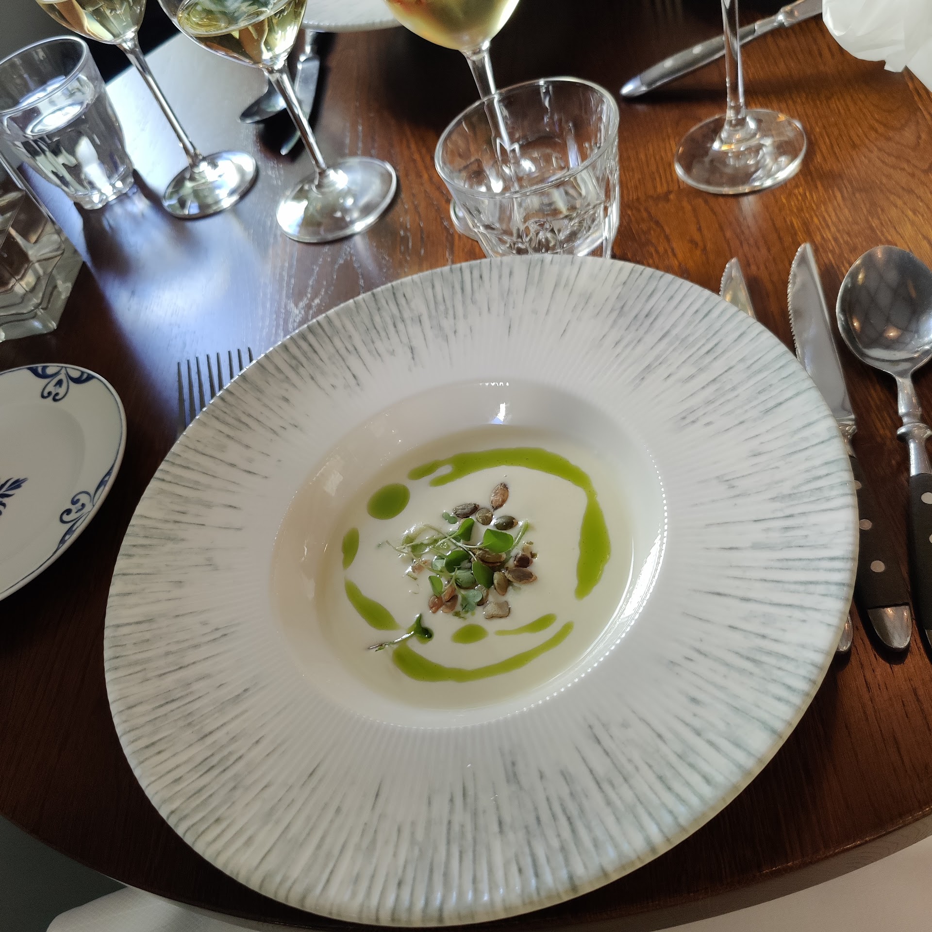 We started the dinner with an aperitif, lillet spritz. A fresh starter that suites the summer that is just around the corner. We opted for the menu with the wine pairing, with the addition of some truffle fries with the main - these are a must have if you come here. The starter was a flounder bisque with fennel, a very tasty and light starter coupled with a buttery chardonnay. The main was flank steak, perfectly cooked, with carrot and red wine sauce, accompanied by a fresh red from burgundy. Followed by a cheese course which was tasty and went very well with the vins doux naturel it was paired with. Dessert was creme caramel with berries. The consistency was spot on, and the sweetness was fine as well.