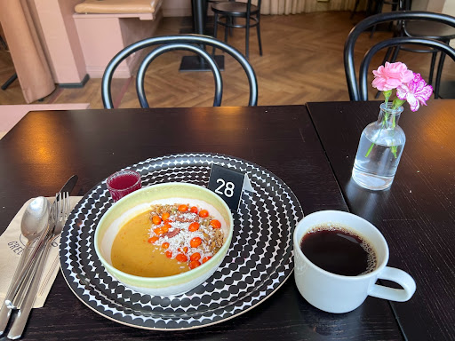 you order at the front, the smoothie bowl and a shot of ginger juice(?) are served on the black and white marimekko-esque plate right away. the combo comes with an avocado toast, and i added a poached egg. it’s served to you to your seat. the coffee, cutlery, and napkins are self service at the station on the left side. the smoothie bowl was good. it was mostly banana from what i could tell, but the homepage it listed last. (the smoothie is “HILBERT THE HIPPIE” and it’s “Sea buckthorn, mango, banana”) the avocado toast was crunchy on the outer edge and soft/mushy on the center. i guess probably avocado was sitting on the toast for a while. i assume it’s to make the making process fast and efficient in the kitchen, but it might have had better texture if it was prepared when it’s ordered. that’s the reason i knocked one star off. the egg was poached just right to my taste.