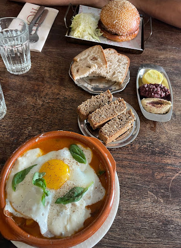 Our recent visit to Nolita in Helsinki was a mixed bag. While the interior is super nice and the mains were delicious, unfortunately, the ambiance was not complemented by the service we received. Despite having a reservation, we were not greeted warmly or with any hospitality. Instead, we were met with a curt "Can I help you somehow?" No one welcomed us or guided us to our table properly. Only one menu was tossed onto the table for the two of us, which felt dismissive. Since I really wanted to visit Nolita for a long time already, we stayed and ordered the bread plate with dips for two, a burger, and shakshuka. The wait for our food was excessively long. Even the bread plate, which you'd expect to be a quick starter, took about 15 minutes to arrive. The waiter sliced the bread using his hands, without a towel or proper hygiene measures, and then left it waiting for the dips for another like 5 minutes. This was not only unprofessional but also concerning from a hygiene perspective. As a bakery, we had high expectations for the bread plate, but it was a disappointment. The plate consisted of four thin, almost transparent slices of bread on one plate and half slices of grain bread on the other. The burger and shakshuka were good, which made the experience a bit nicer. The burger was juicy and flavorful, and the shakshuka was interesting and delicious - not traditional one, mixed with zucchini and potato. However, these dishes alone were not enough to redeem the overall experience. Even when we finished our meal, it took quite a time for the bill to arrive. The waiters were engaged in conversation with other customers, possibly regulars or friends, and at one point, one of them went outside to play with a child. This lack of attention was frustrating, especially as we were trying to conclude our brunch experience.