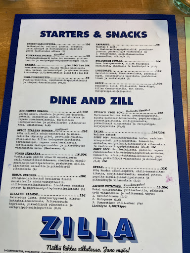 Ravintola Zilla was a decent dining experience, but mot without it’s disappointments. We started with the Bolognese Petals, which took quite some time to come out, but were wuite tasty once received. It seems that either our server forgot to put the order in or the kitchen was understaffed (although, for a Sunday Evening, the place was quite empty). Then, we received our Pizza and Burger. The New York Pizza had great flavor and was well sized for the price, but was a bit greasy. The Big Cheese Burger was completely underwhelming. We didn’t leave hungry, but this was not anything to write home about. Just an average restaurant...