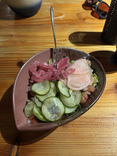 Shepherd’s starter salad VE, G Salad with balsamic vinaigrette, pickled cucumber, radish, tomato-basil salsa and pickled red onion.