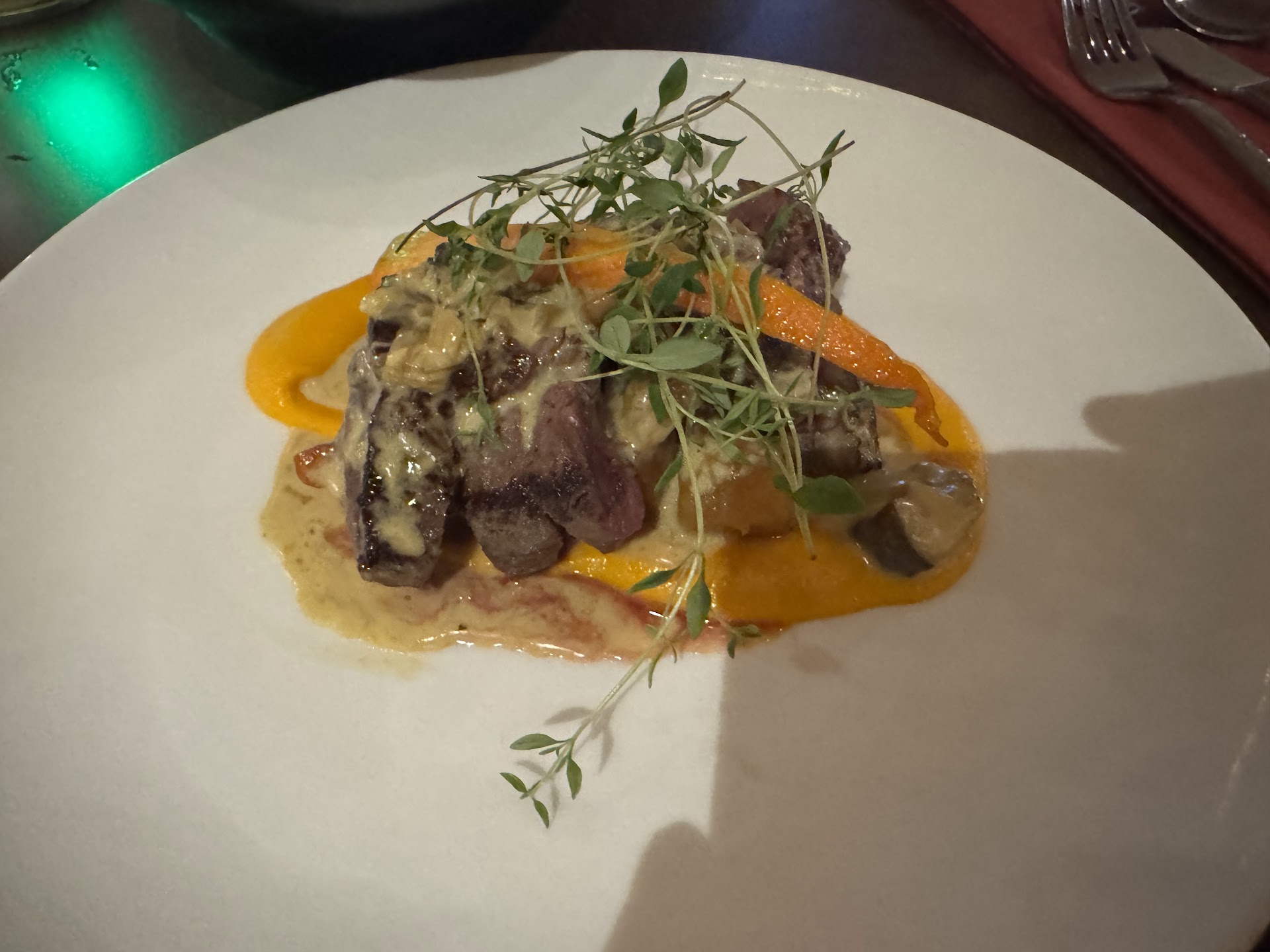 Grilled Reindeer: The grilled reindeer was a highlight, featuring tender meat complemented by a rich, creamy sauce infused with local forest mushrooms. The dish was accompanied by crispy vegetables and a root vegetable purée, creating a harmonious blend of flavors and textures.