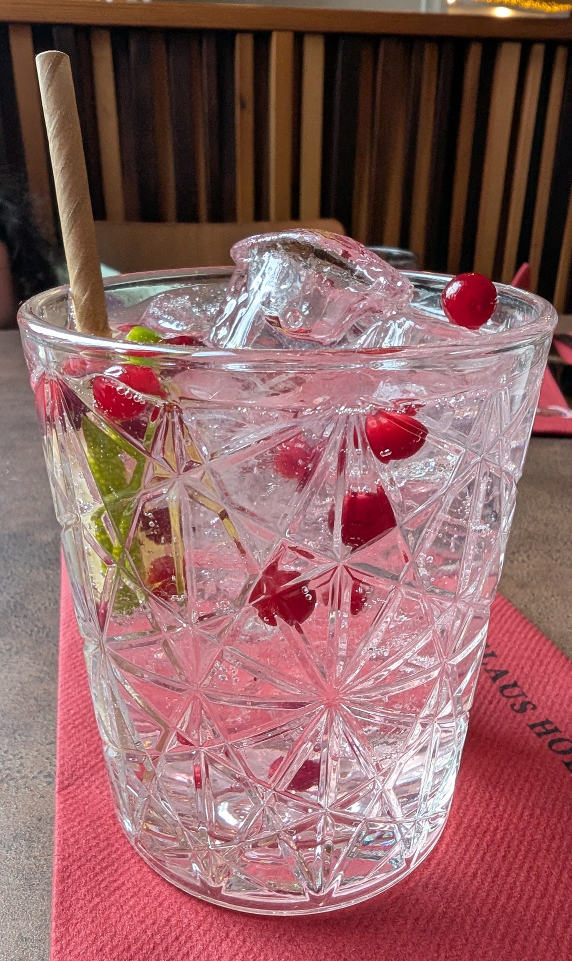 I had a couple of Christmas themed cocktails which were lovely. Definitely unique to the area and well presented. Ordered a Pinot with my steak at the start. When it didn't come out, I asked for it again, and was charged twice for one glass. That was very easily rectified when the bill came.